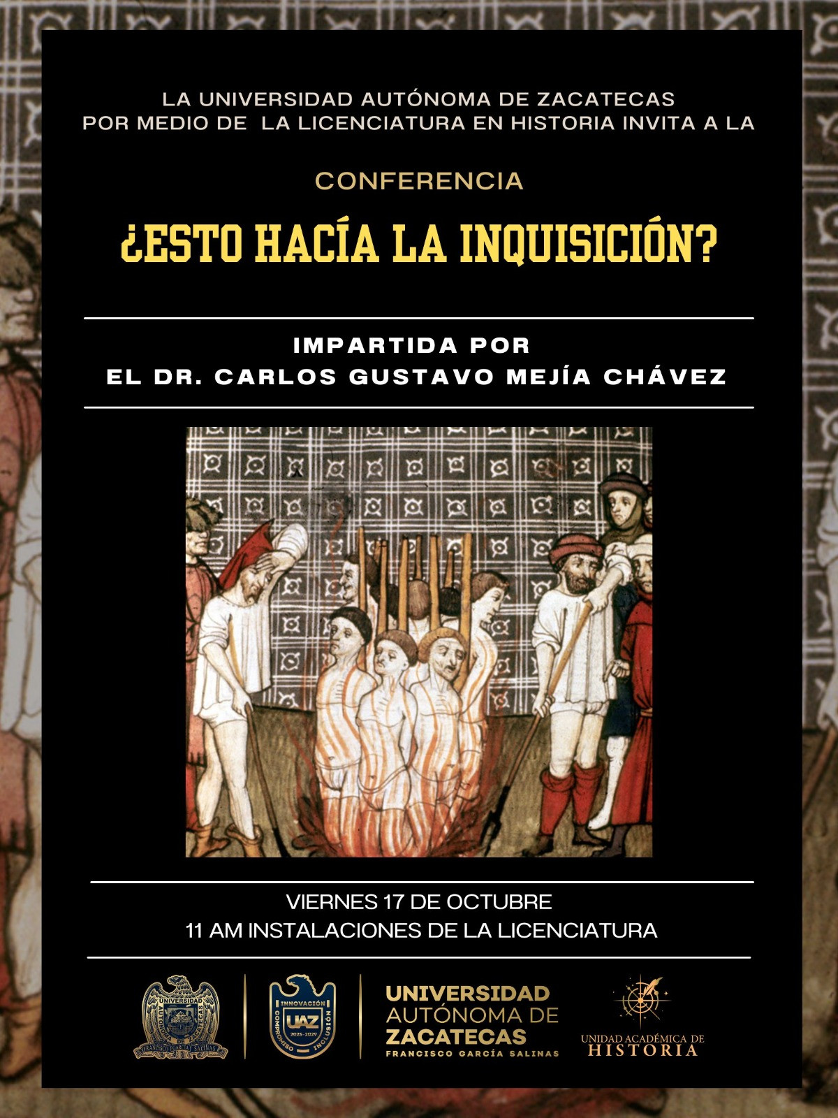 Se les hace una cordial invitación a unirse a la Conferencia "¿Esto hacía la Inquisición?" impartida por el Dr. Carlos Gustavo Mejía Chávez, el próximo viernes 17 de octubre a las 11 am.